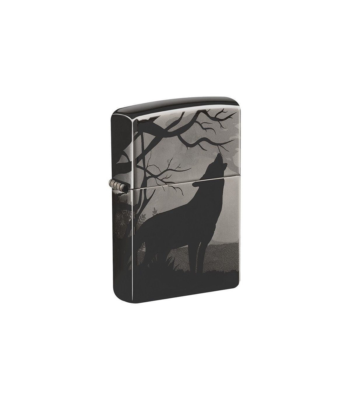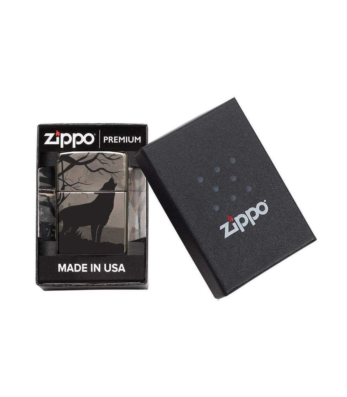 Che tu sia un lupo solitario o una parte di un branco, questo nuovo accendino da lupo è destinato a soddisfare tale esigenza. In questa splendida scena, troverai la sagoma di un lupo, che ulula nella notte, nel profondo di una foresta oscura. Ruota l'accendino per trovare un altro lupo che fa la guardia sul retro. Questa immagine circumnaviga senza soluzione di continuità l'intera superficie di un accendino Black Ice ® usando il processo Photo Image 360 °. Viene confezionato in una confezione regalo. Per prestazioni ottimali, riempire con carburante Zippo più leggero .