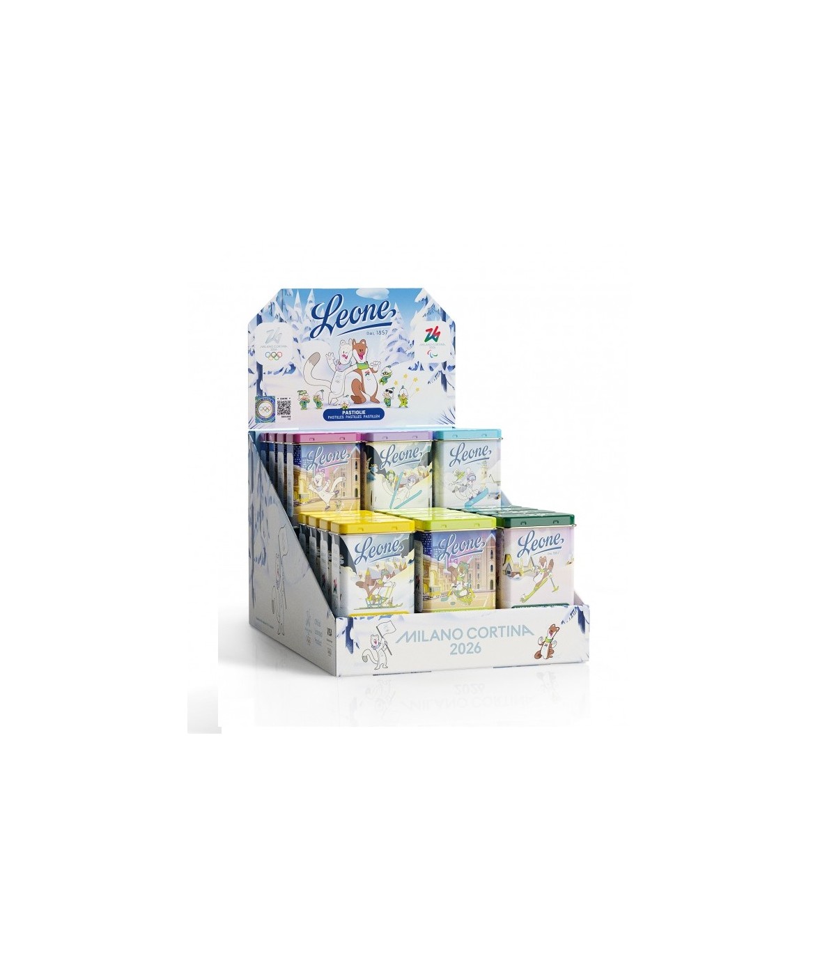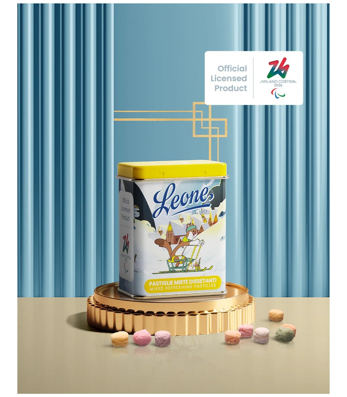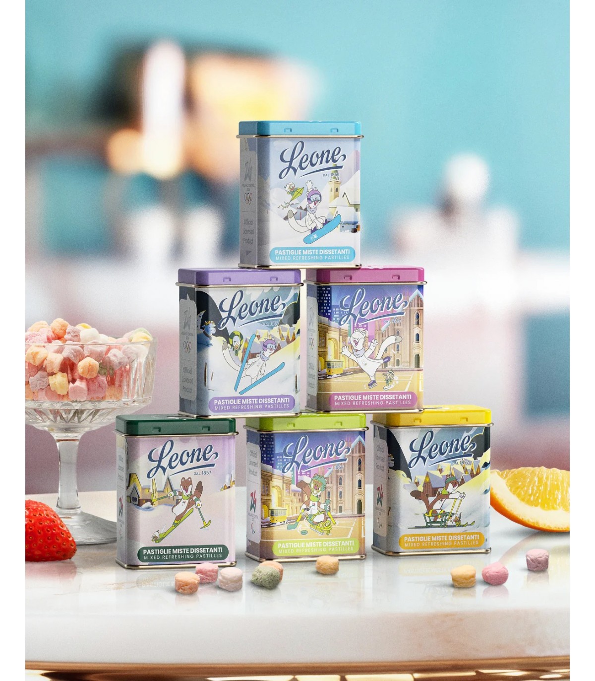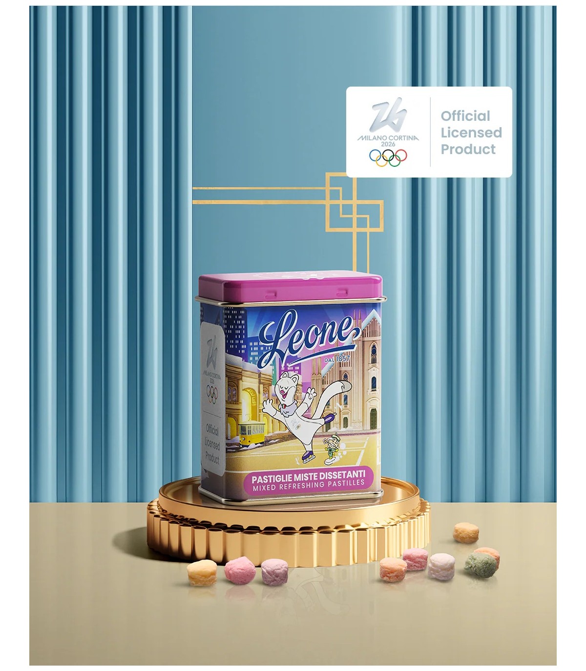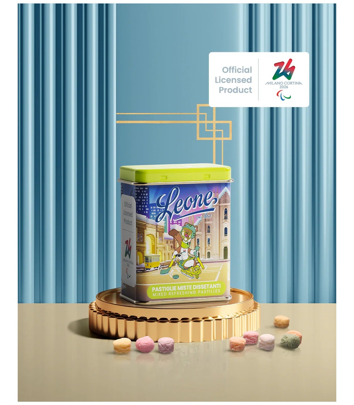 PASTIGLIE LEONE DISSETANTI COLLEZIONE olimpiadi milano-cortina 2026 lattina in metallo DA 30g CONF. DA 24 PZ. gusti assortiti