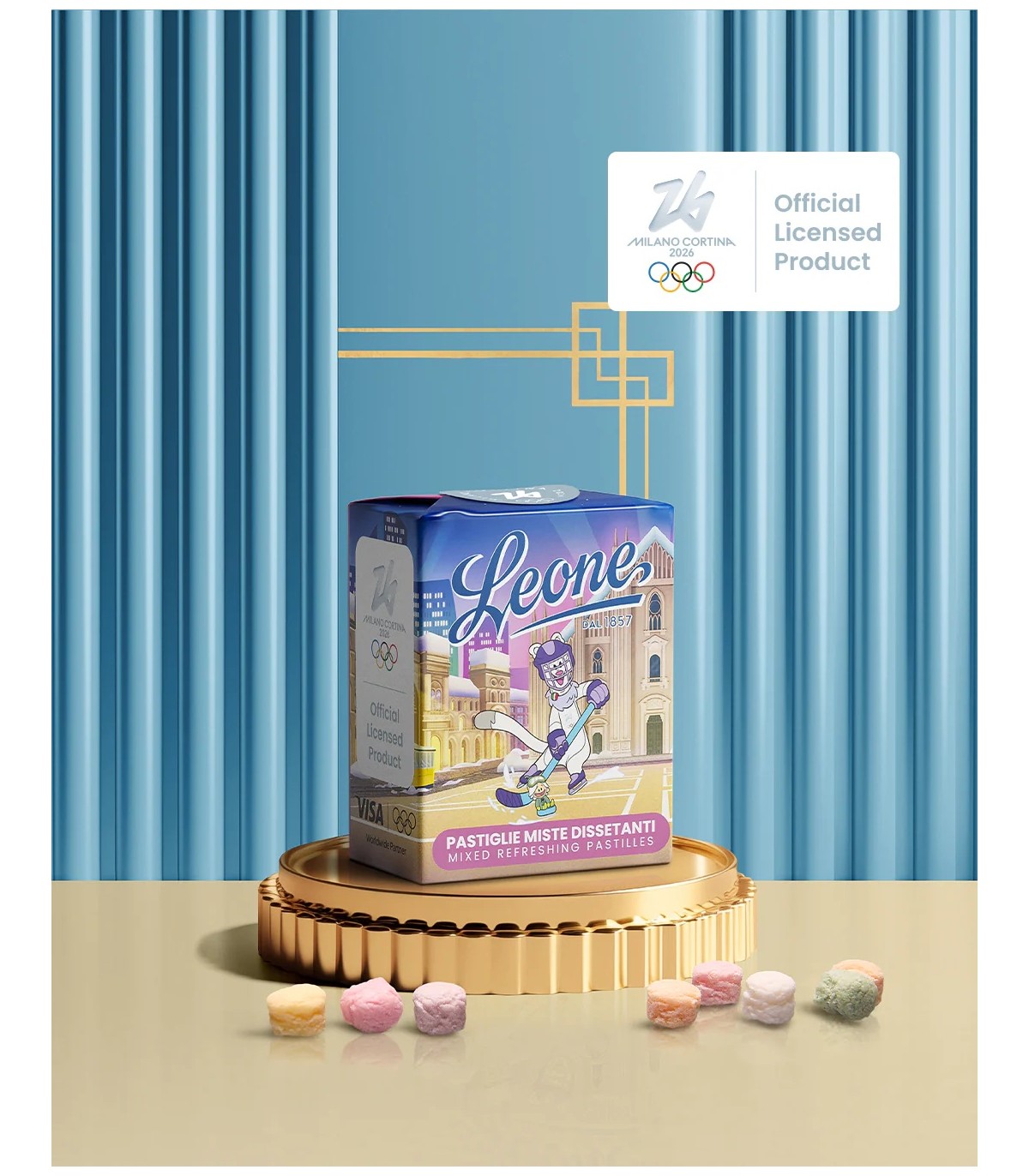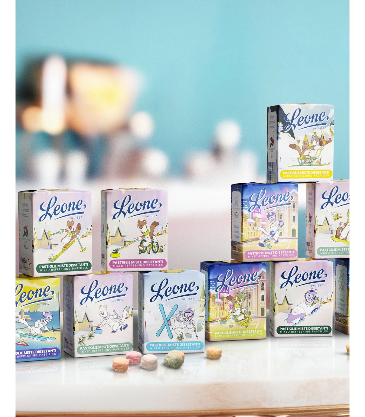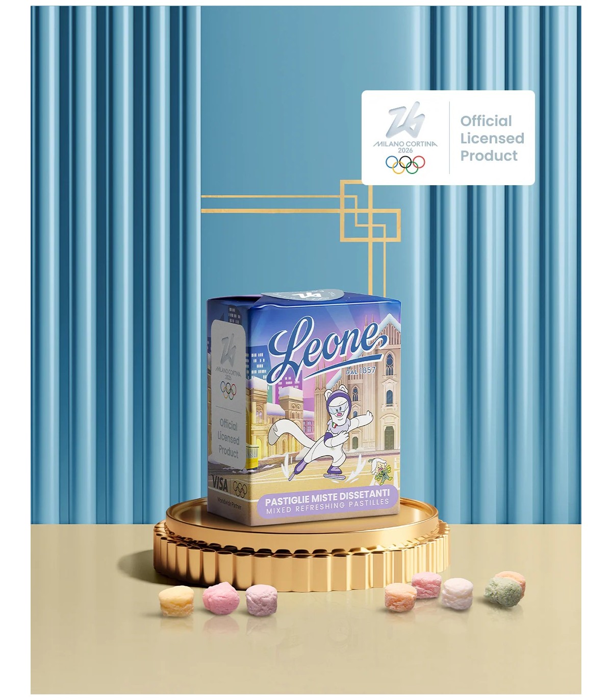 PASTIGLIE LEONE DISSETANTI COLLEZIONE olimpiadi milano-cortina 2026 IN SCATOLETTA DA 27g CONF. DA 36 PZ. gusti assortiti