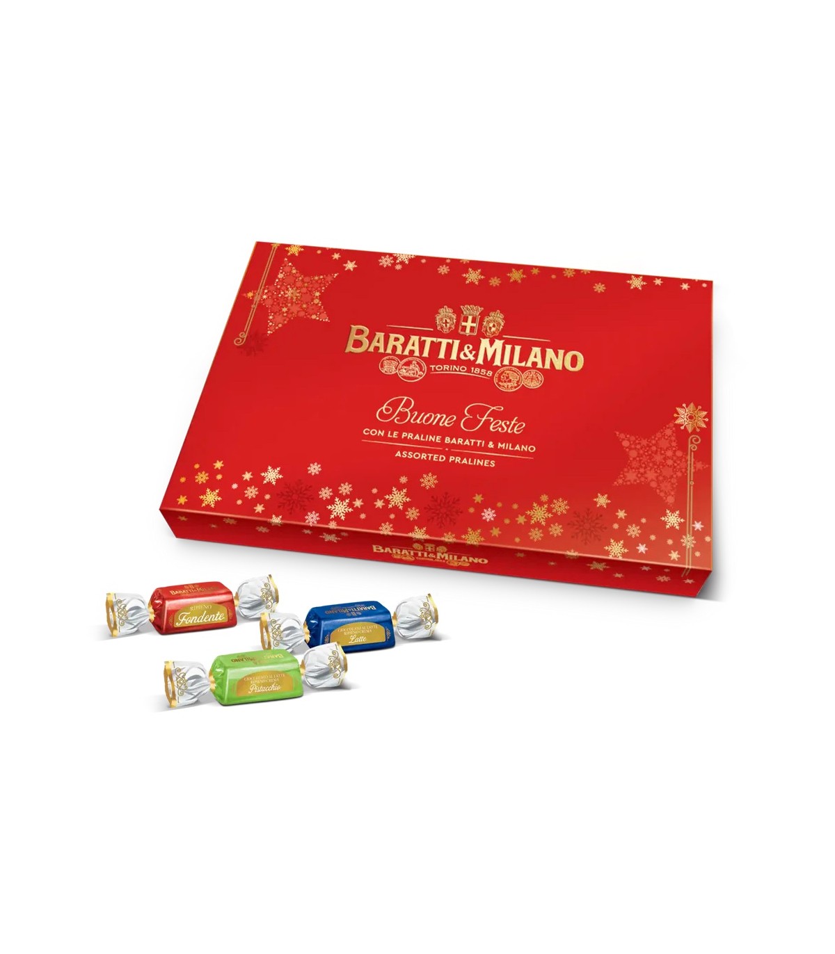 CONFEZIONE REGALO NATALE BARATTI&MILANO CON PRALINE DI CIOCCOLATO AL LATTE ASSORTITE DA 230G.