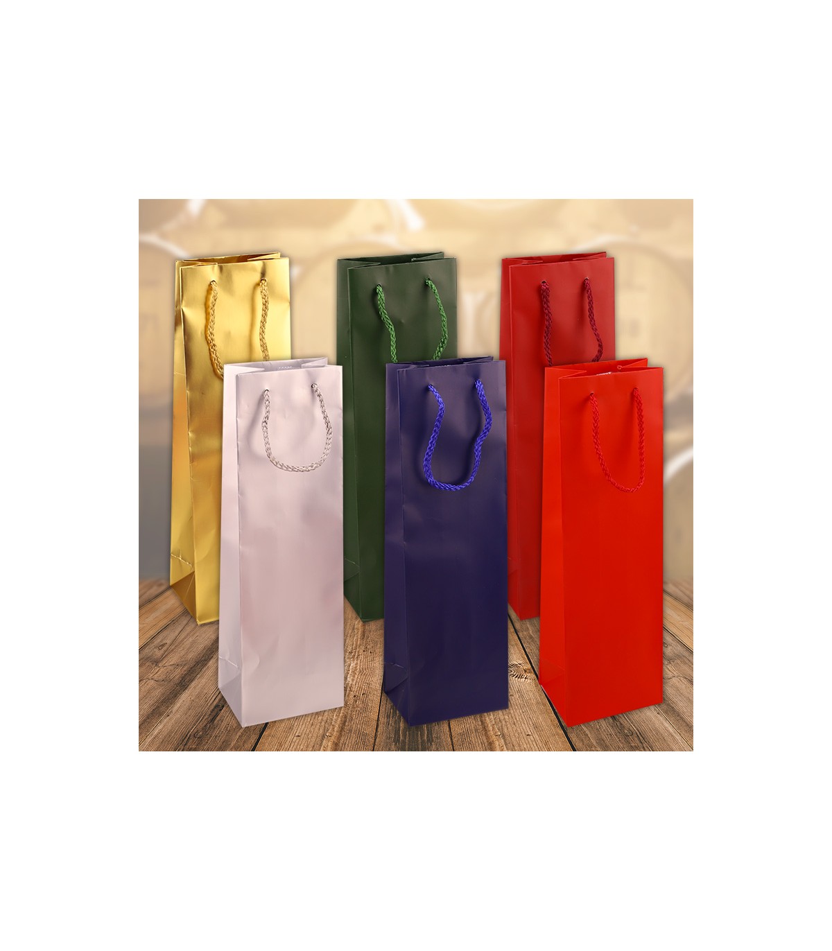 Buste IN carta Opaca Portabottiglie CON MANICO IN CORDA COLORATO MisURA 12x9x39 CONF. 12 PZ. ASSORTITE IN 6 COLORI