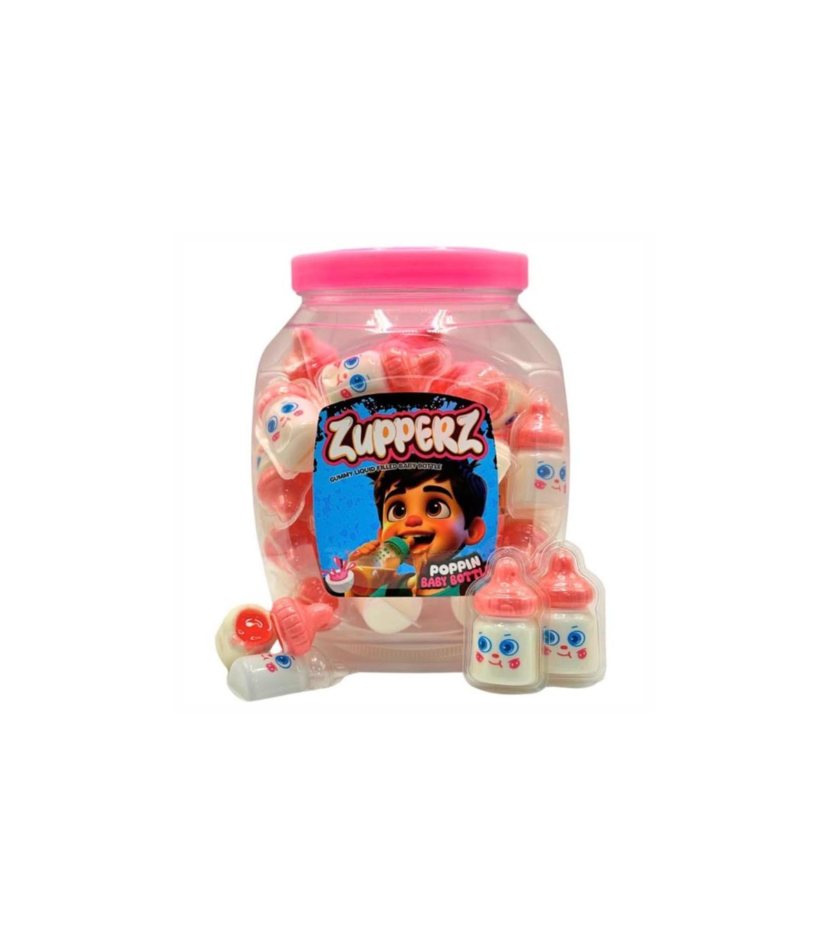CARAMELLE GOMMOSE ZUPPERZ BABYBOTTLE BIBERON RIPIENI DI GEL ALLA FRAGOLA CONFEZIONATE SINGOLARMENTE EXPO. 50 PZ. DA 18 GR.
