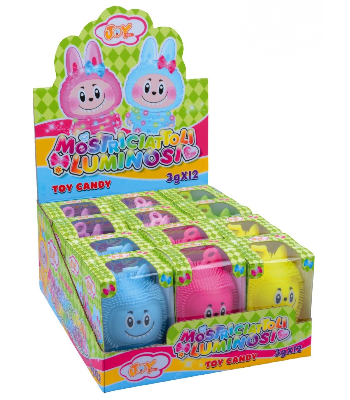 MOSTRICIATTOLI GOMMOSI E LUMINOSI GIOCATTOLO CON GUSTOSE CARAMELLE ASSORTITI IN 6 COLORI CONF DA 12 PZ DA 3G