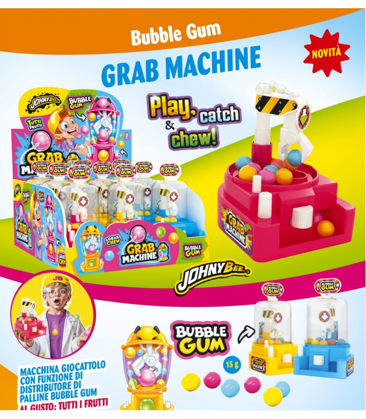 GRAB MACHINE GIOCATTOLO CON FUNZIONE DI DISTRIBUTORE DI PALLINE BUBBLE GUM AI GUSTI ASSORTITI CONF.9PZ X 15GR