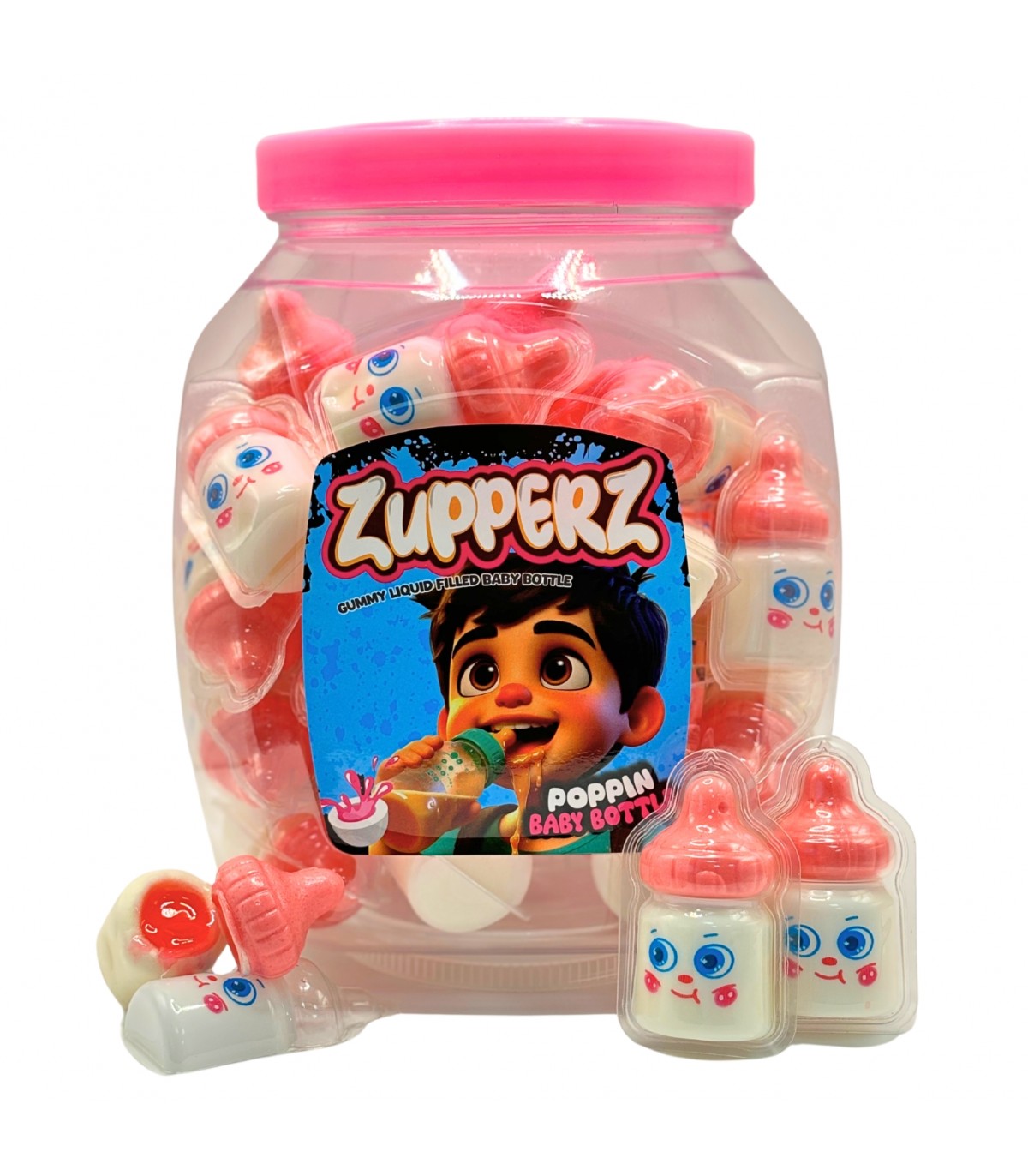CARAMELLE GOMMOSE ZUPPERZ BABYBOTTLE BIBERON RIPIENI DI GEL ALLA FRAGOLA CONFEZIONATE SINGOLARMENTE EXPO. 50 PZ. DA 18 GR.