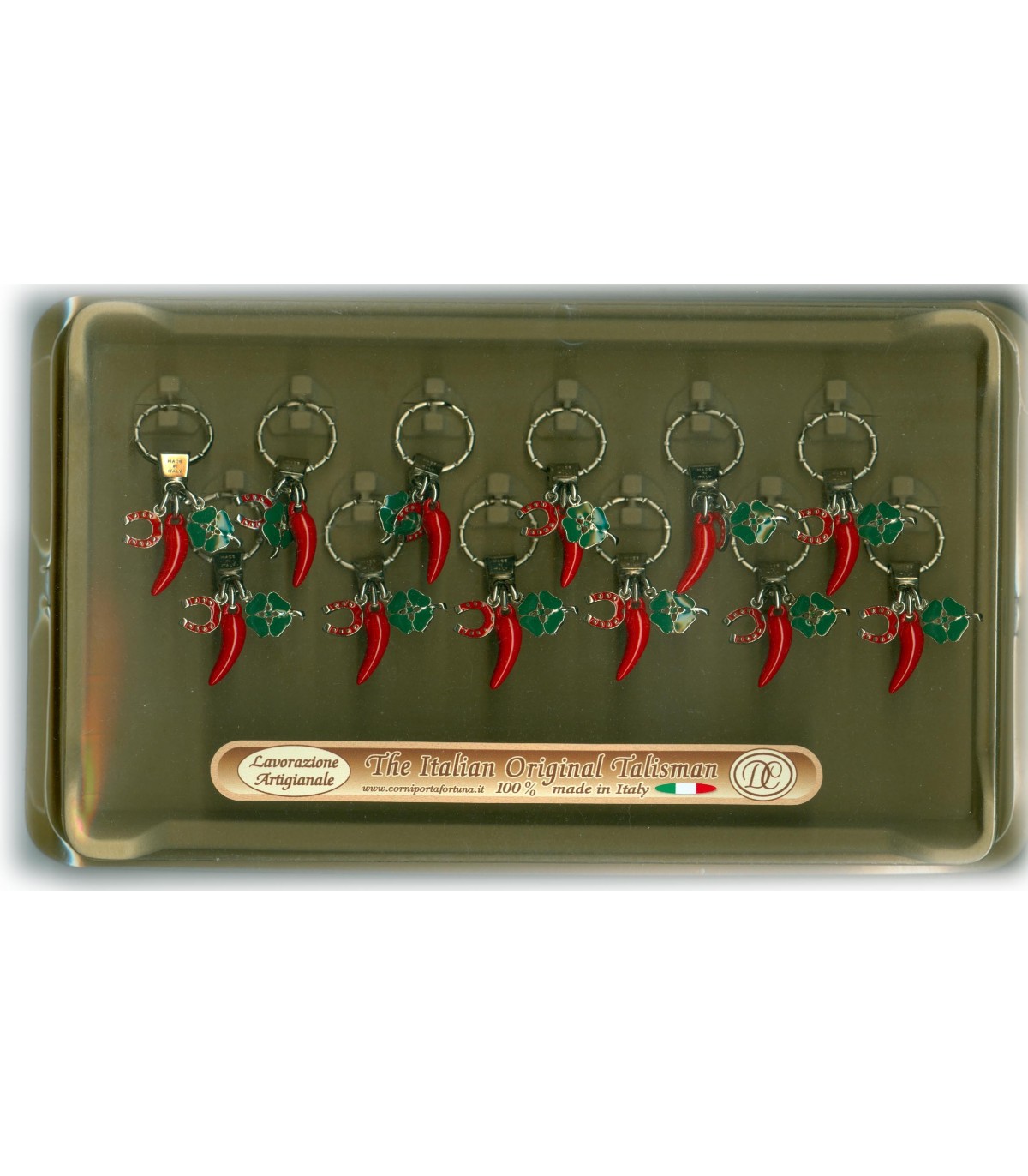 Corno Portafortuna In Metallo Artigianale e Smaltato a Mano Con Quadrifoglio e Ferro di Cavallo Cartella da 12 pz.