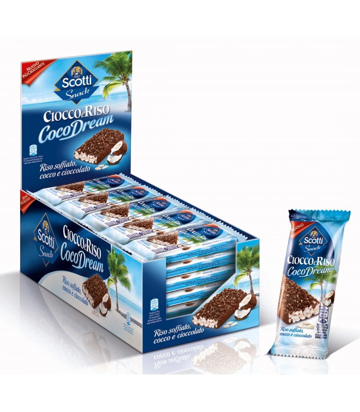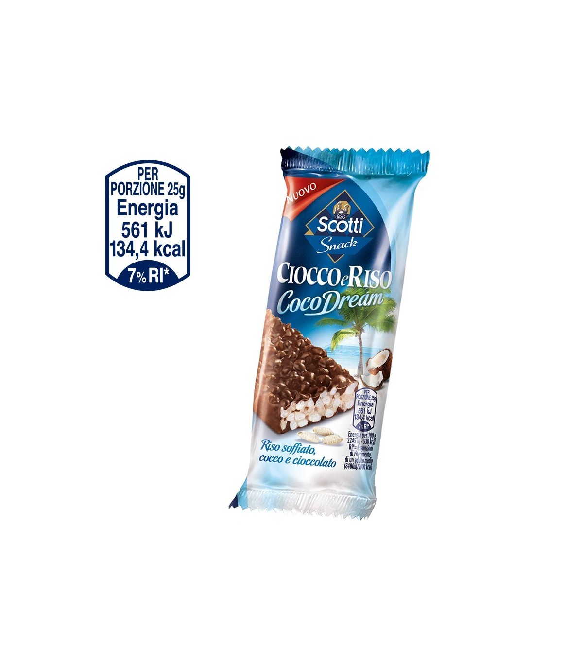 Ricopertura crema al latte al gusto di cocco 46%: zucchero, grassi e oli vegetali non idrogenati (palma), latte magro in polvere, emulsionanti: lecitina di soia ; aromi: cocco. Ricopertura di cioccolato fondente 32%: zucchero, grassi e oli vegetali non idrogenati (palma), cacao magro in polvere, emulsionanti: lecitina di soia, E476; aromi; 9% di riso soffiato; 8% di riso estruso (farina di riso); 5% cocco rapè. Può contenere tracce: glutine, nocciole e arachidi.