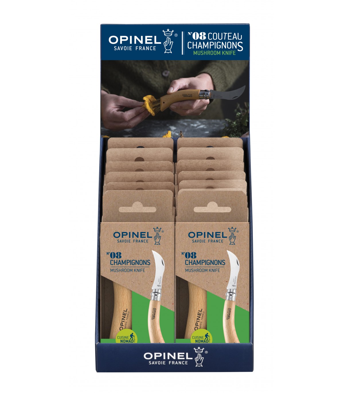 espositore da 12 ColtellI ChiudibilI e TascabilI OPINEL da funghi con manico in Legno DI FAGGIO Lama in acciaio inox misura n°8
