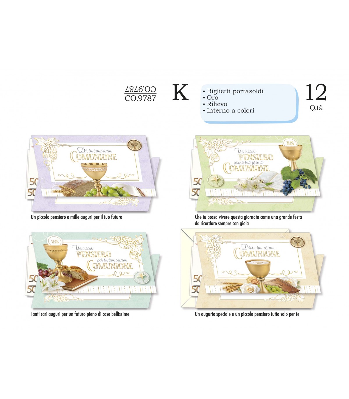 Biglietto CROMO PRIMA COMUNIONE PORTASOLDI CON LAVORAZIONE IN ORO E INTERNO A COLORI CONF. 12 PZ. ASSORTITI