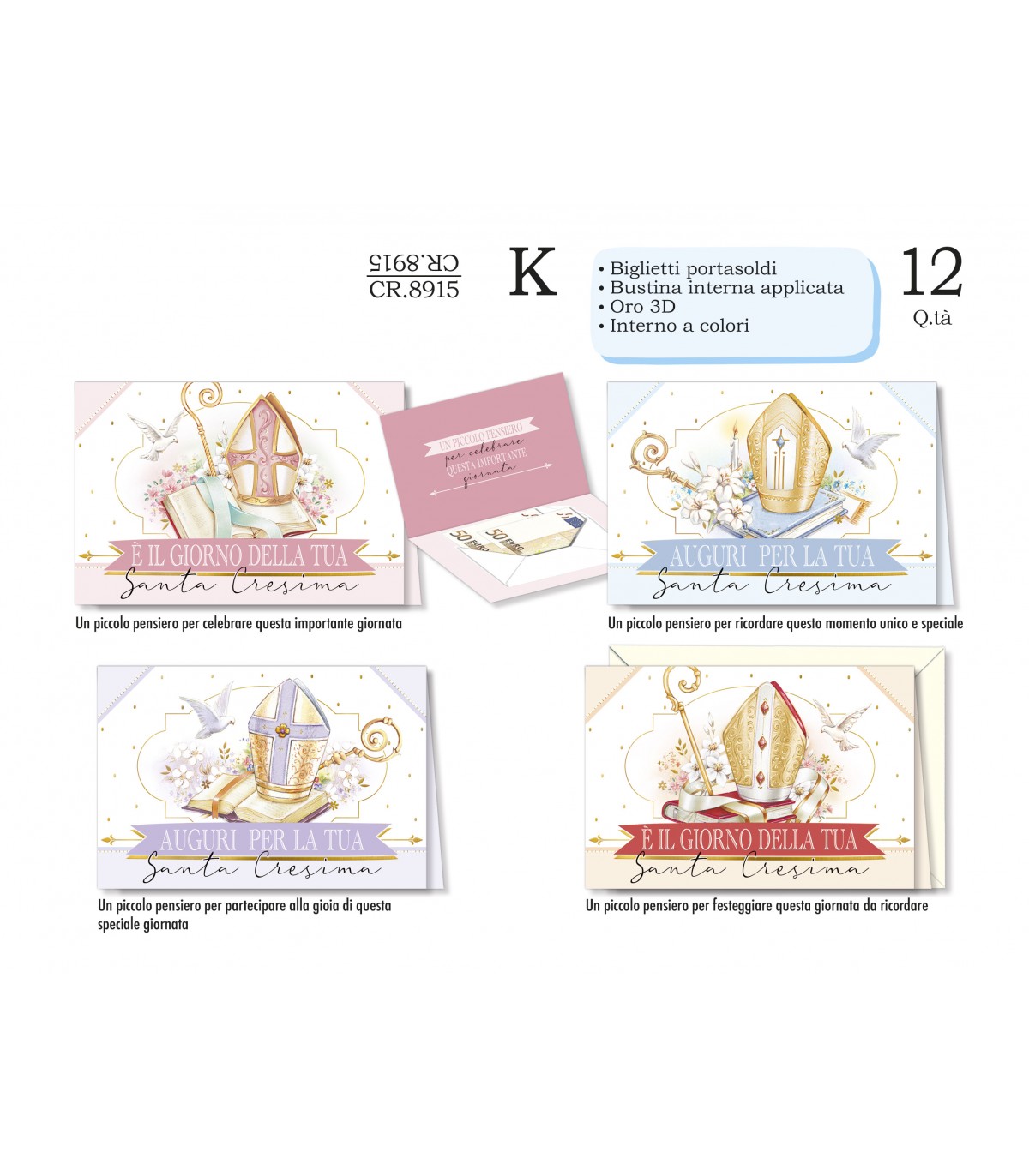 Biglietto CROMO CRESIMA PORTASOLDI CON LAVORAZIONE IN ORO IN 3D E INTERNO A COLORI CONF. 12 PZ. ASSORTITI