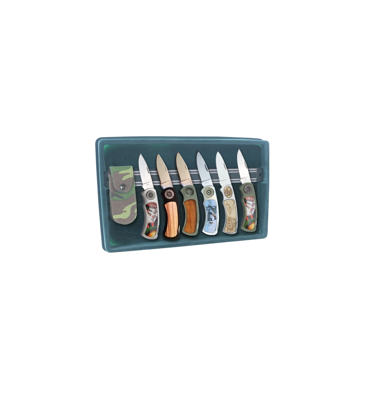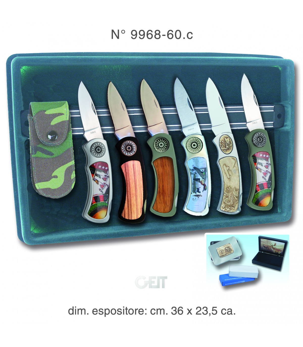 COLLEZIONE GEIT 12 COLTELLI EMBLEMI CON FODERI CAMOU E LAMA DI ACCIAIO CON ESPOSITORE IN VELLUTO E BARRA MAGNETICA ESTRAIBILE