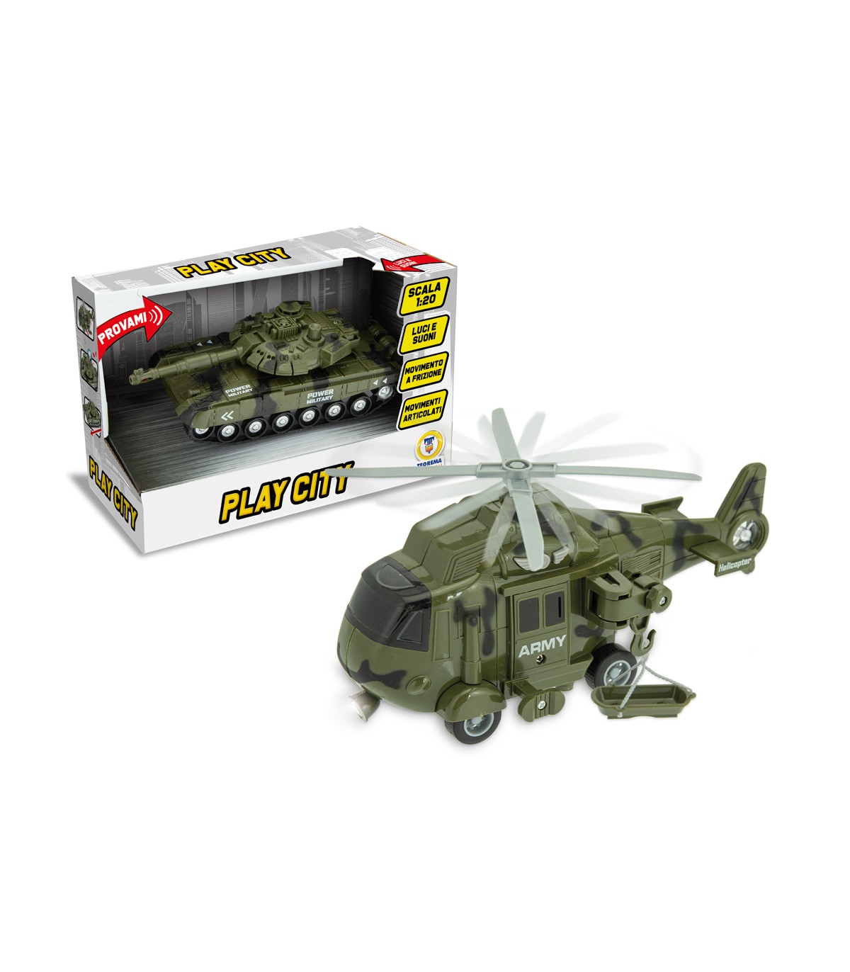 PLAY CITY MEZZI MILITARI ELICOTTERO E CARRO ARMATO A FRIZIONE LUCI E SUONI SCALA 1:20 TEOREMA GIOCHI