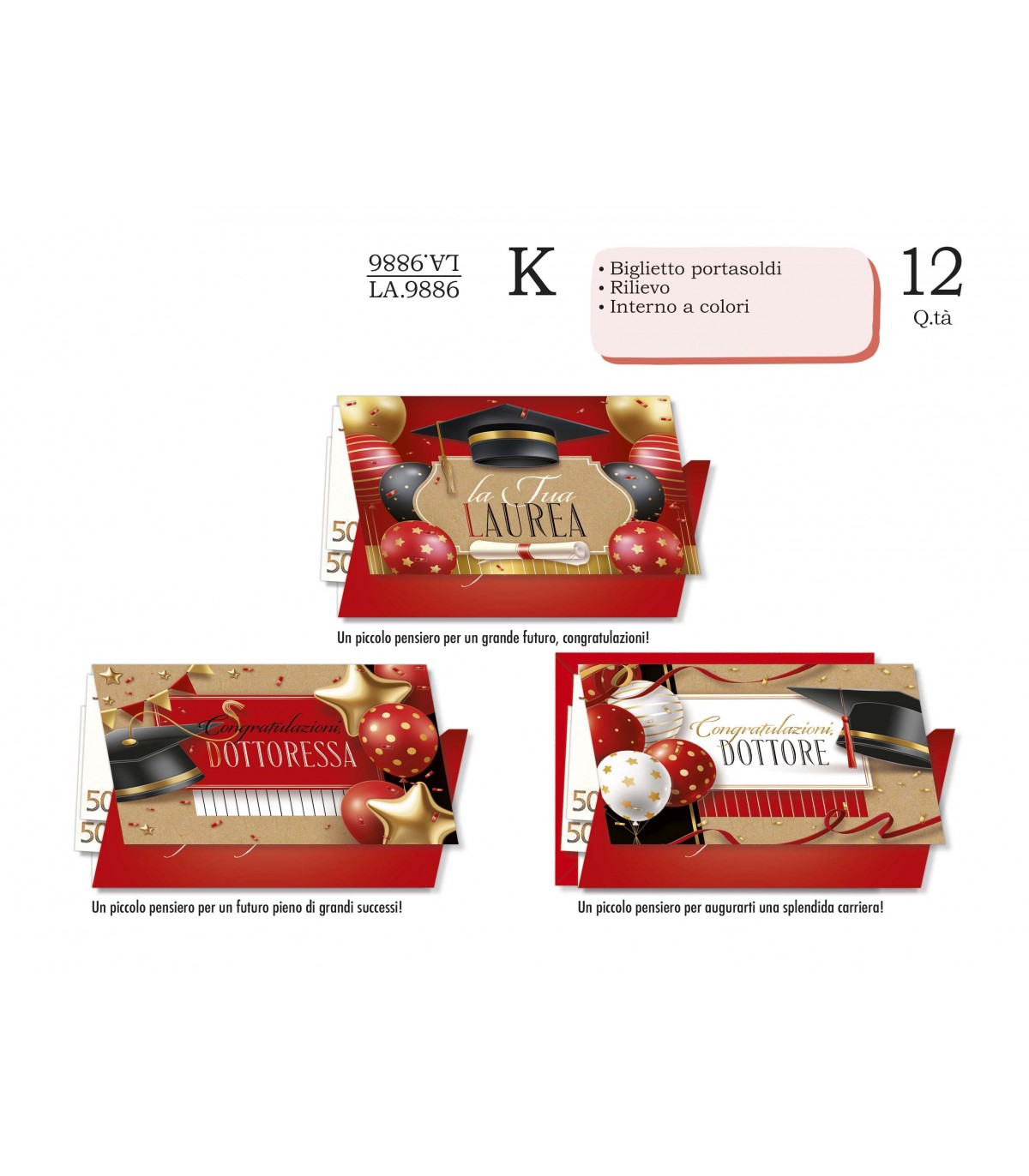 Biglietto CROMO LAUREA PORTASOLDI CON INTERNO A COLORI CONF. 12 PZ. ASSORTITI