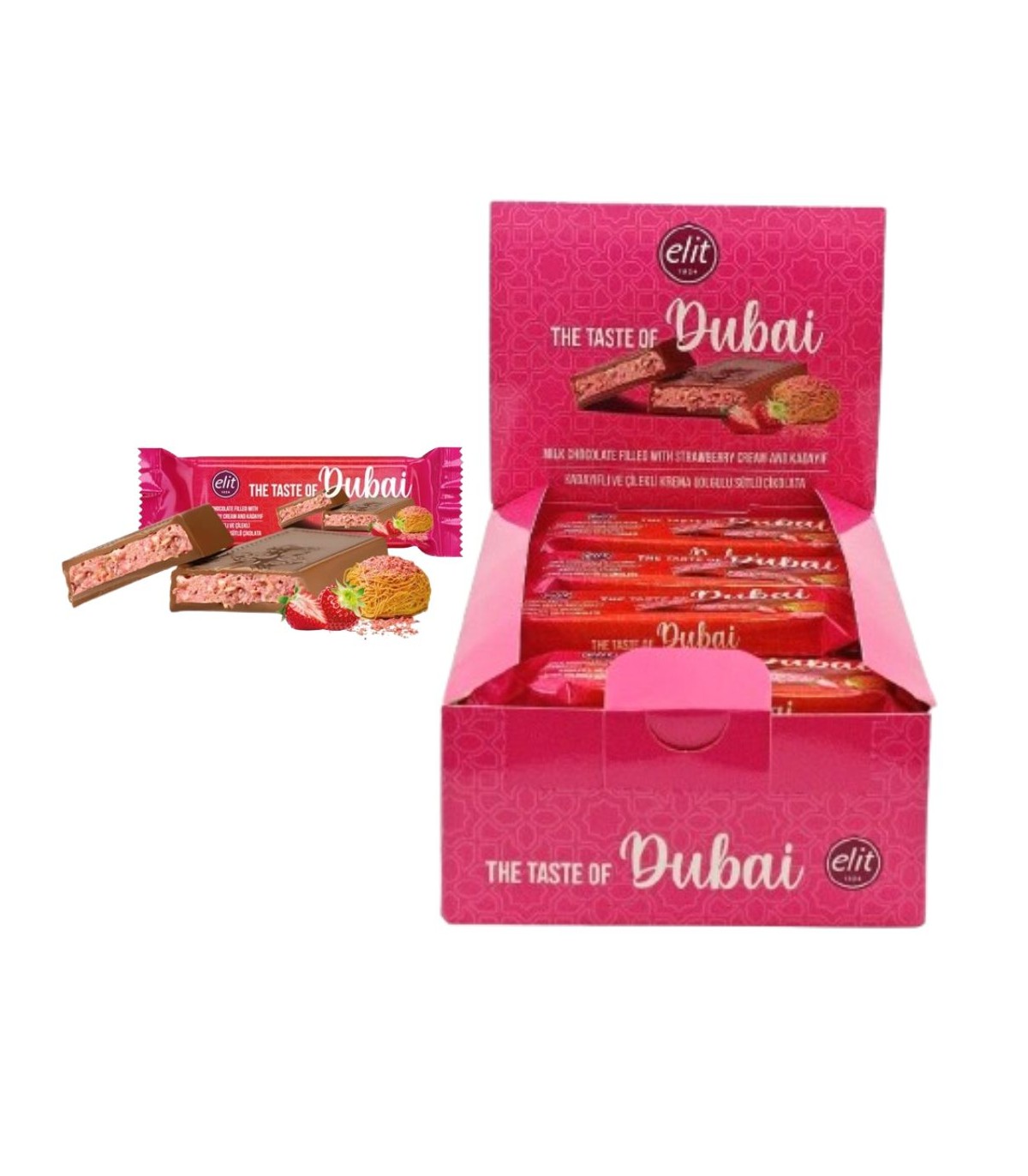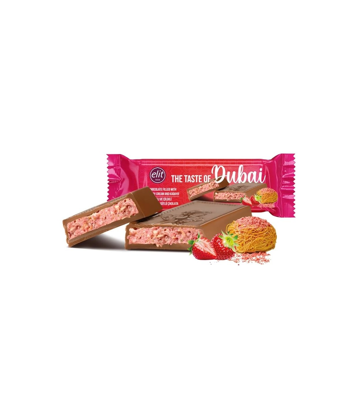 Elit Dubai LUSSUOSA Barretta di cioccolato DA 30GR FRAGOLA e Kadayif RACCHIUDE L'ESSENZA DEI SAPORI ORIENTALI CONF.24PZ