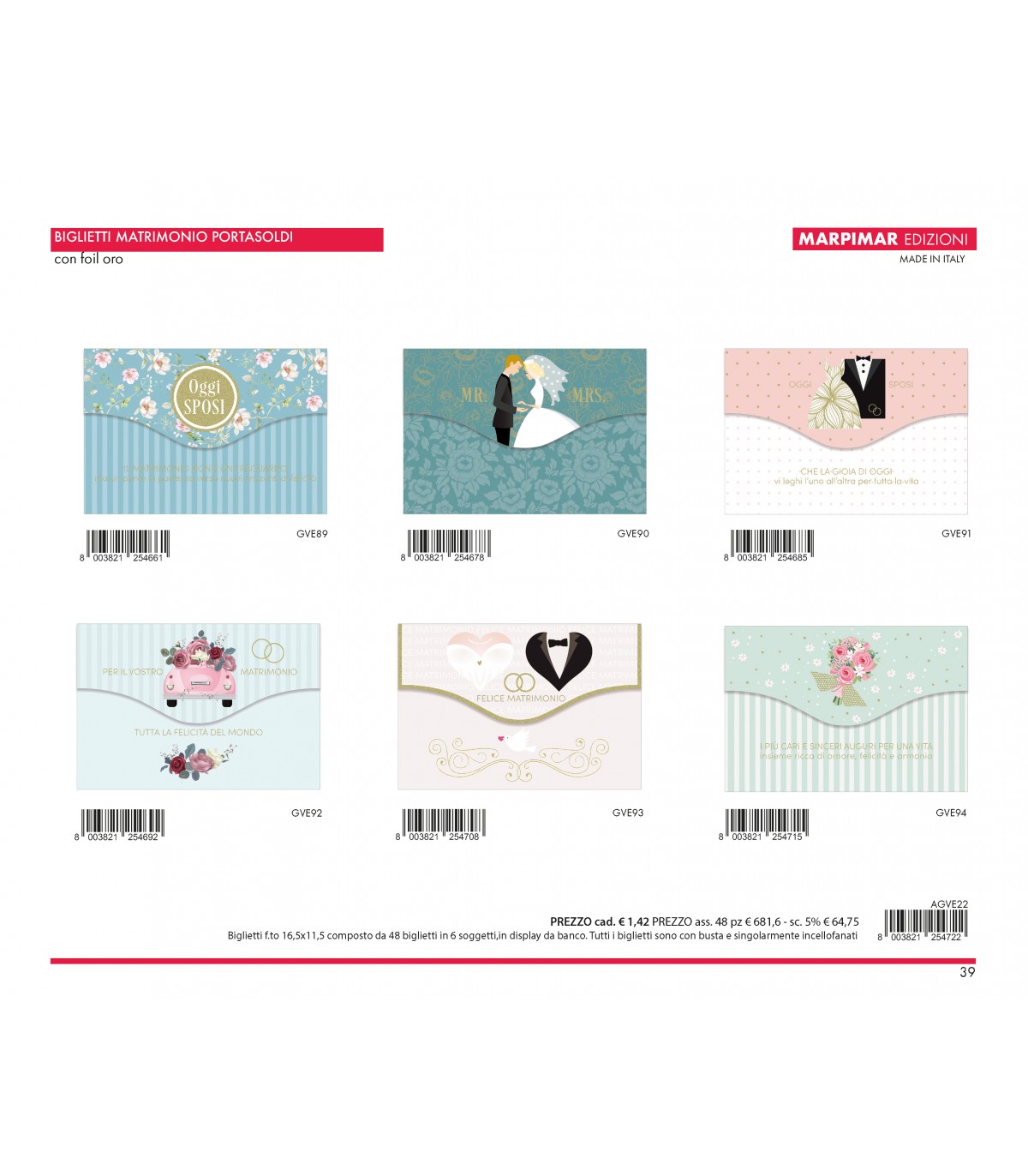 BIGLIETTO MATRIMONIO PORTASOLDI MARPIMAR CON FOIL ORO CONF. 12 PZ. ASSORTITI