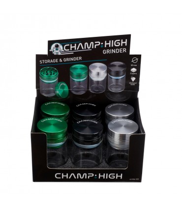 GRINDER CHAMP IN METALLO 2 parti CON VASCHETTA IN VETRO sottovuoto Diam. 50mm H. 8.3 CM conf. 6 pz. assortito con 3 colori