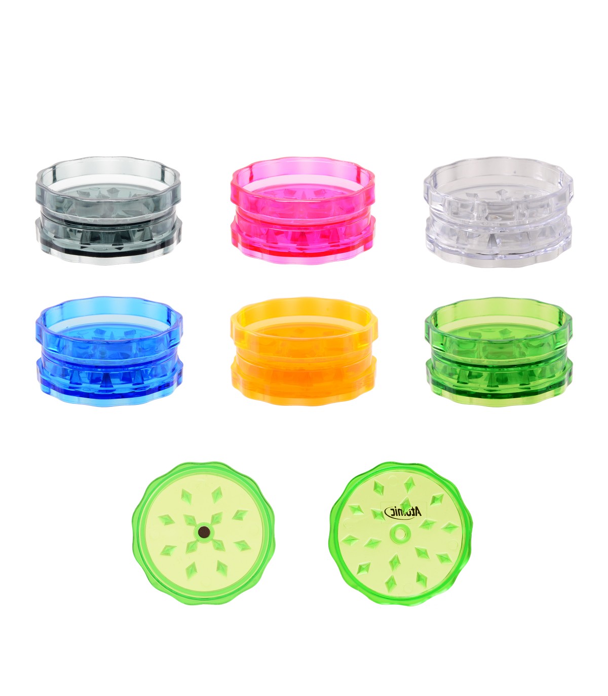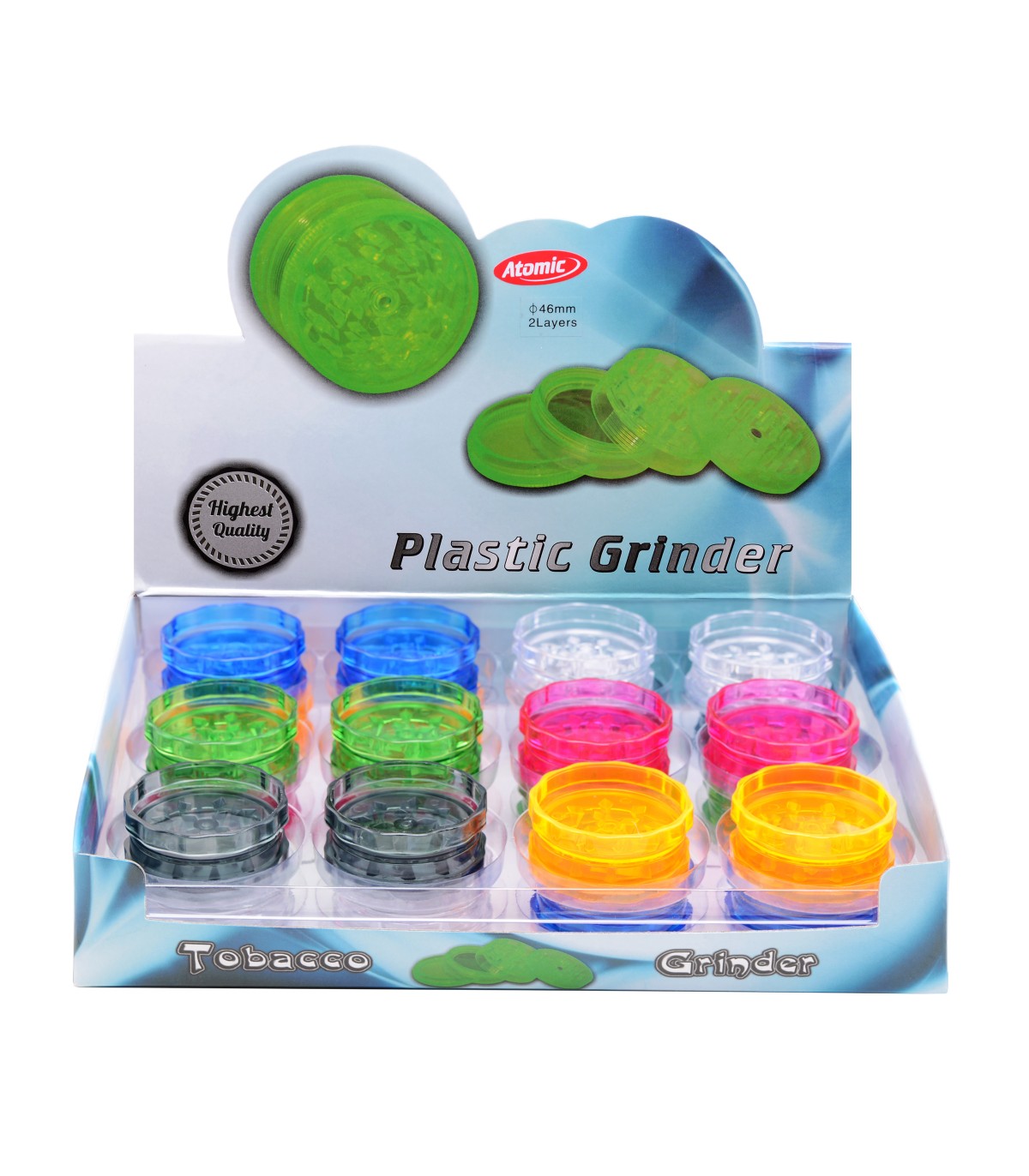 Grinder Atomic in Plastica 2 Parti DIAM. 46MM Expo da 24 pz. assortito in 6 colori