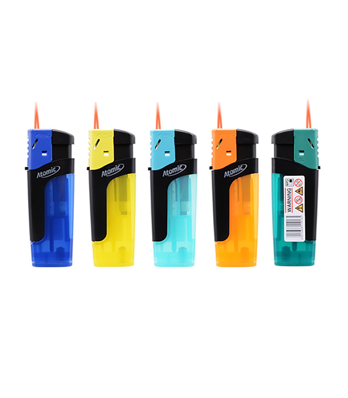 Accendino Atomic Turbo ELETTRONICO REDFLAME COLORATO TRASPARENTE conf. 50 pz. COLORI ASSORTITI